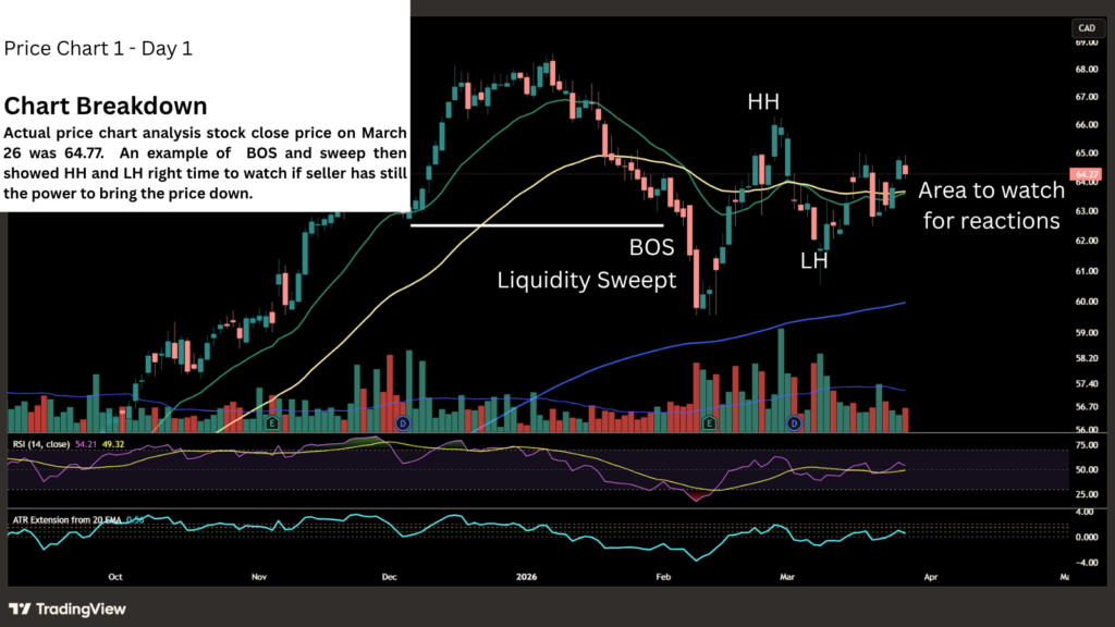 On March 27, the stock closed –1.24% on the TSX. The candle attempted to push slightly above the previous day’s low, showing early signs of buyer defense, but the market couldn’t sustain that strength. Sellers stepped back in and dragged price lower into the close. This type of candle doesn’t confirm anything yet; instead, it signals hesitation and invites deeper bar‑by‑bar observation.